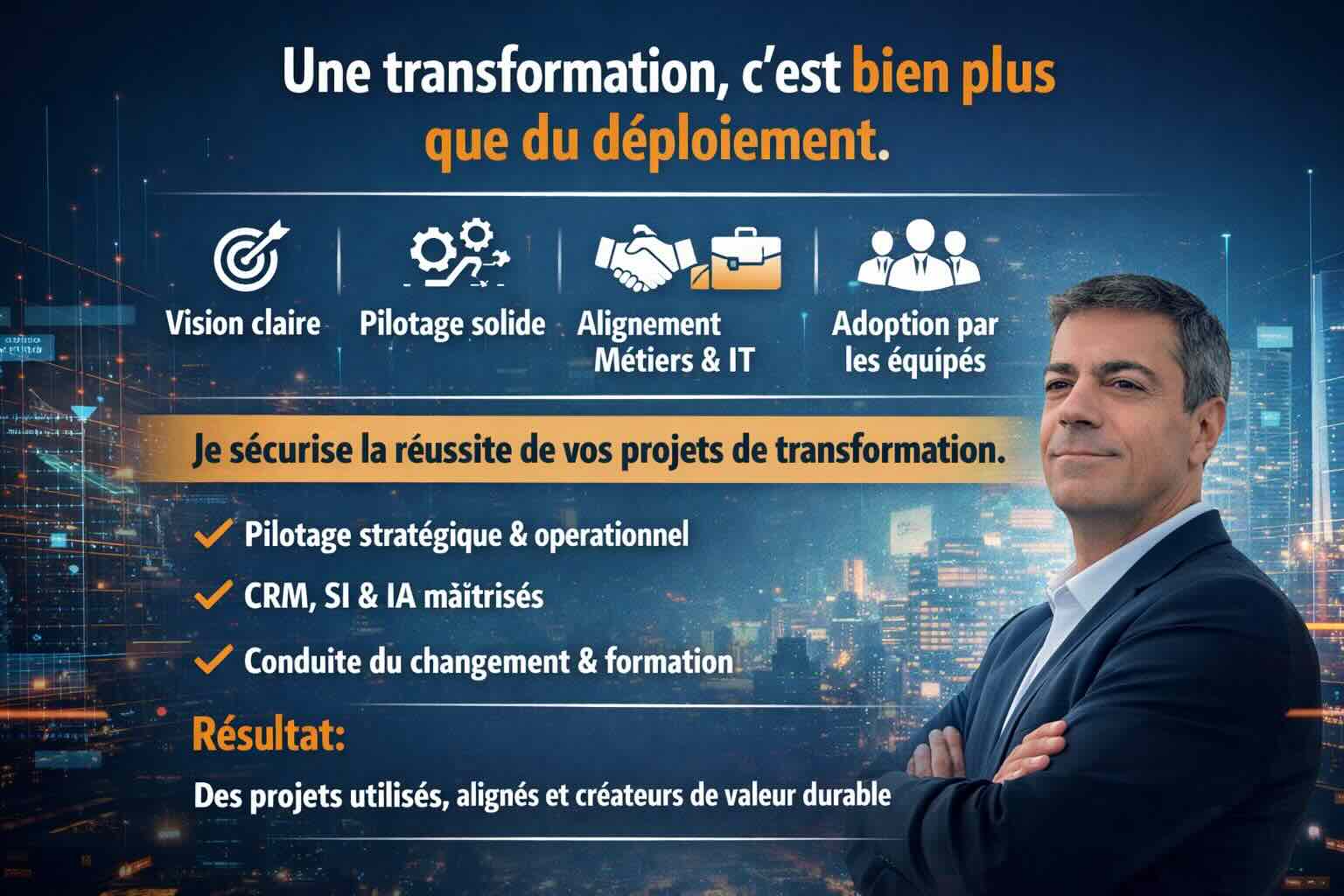 J’accompagne l'organisation pour définir une vision claire, aligner les enjeux métiers et prioriser les leviers de modernisation. J’évalue les processus, les usages et la maturité interne afin de construire une trajectoire réaliste, progressive et adaptée à l’organisation. Je coordonne les acteurs, sécurise les décisions et structure le pilotage pour éviter les dispersions, les retards et les surcoûts. J’intègre la dimension humaine au cœur du projet afin de garantir l’adhésion, l’appropriation et l’évolution des pratiques. Mon rôle est d’assurer une transformation utile, mesurable et durable, au service de la performance et de la fluidité opérationnelle.